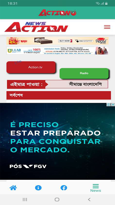 Action TV, um dos Novos Ent. Bangla IPTV. Tudo começou com o compromisso de um jornalismo destemido, investigativo, informativo e independente. Esta tv ip começou a fornecer atualizações de notícias em tempo real com o uso máximo da tecnologia moderna a partir de 2019. Últimas e últimas notícias de casa e no exterior, entretenimento, estilo de vida, relatórios especiais, política, economia, cultura, educação, tecnologia da informação, saúde, esportes , colunas e recursos estão incluídos nele. Uma equipe genial da Action Media Ltd. foi construída com um grupo de jovens jornalistas enérgicos do país. Estamos tentando construir uma ponte com os bengalis em todo o mundo e adicionando uma nova dimensão ao IPTV.