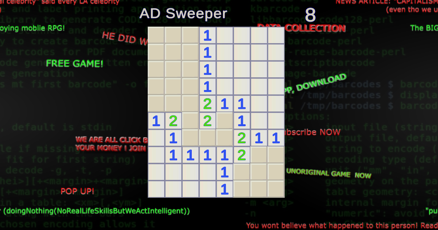 Its like Mine Sweeper, but instead of mines, its Ads. Click on the tiles to uncover the underneath. Try to avoid the Ads . once all tiles without an Ad under it are uncovered, you win! I might be a mobile game developer but I hate Ads just as much as you do. I came up with this original idea , so before a big company steals it and makes a better version , enjoy a game where you actually experience a punishment for losing. (ads are skippable , I'm not that cruel )