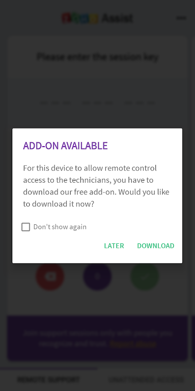 Com este complemento, seu dispositivo pode ser controlado remotamente por meio do aplicativo do cliente Zoho Assist. Instale o complemento somente quando for solicitado a ingressar em uma sessão de suporte remoto por um técnico de suporte autorizado. Usando a API de acessibilidade do SO Android, o complemento concede ao técnico acesso de controle remoto. Ative o aplicativo nas configurações de acessibilidade no seu dispositivo Android.