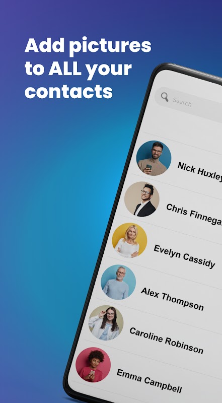 Adicione fotos de perfil aos seus contatos com apenas um toque. Sem configuração, sem inscrição, sem anúncios.