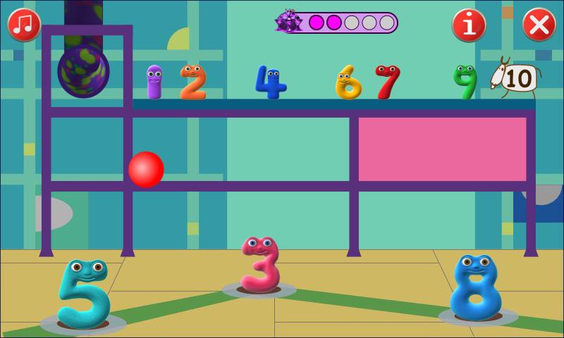 A Numberjack is trapped in the Puzzler’s bubble. Choose numbers that add up to the trapped Numberjack. Count the splats to work out how many more are needed. Burst the bubble to set the Numberjack free.
