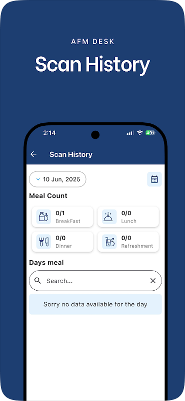 O AFM Desk capacita os gerentes de alimentação com um gerenciamento de refeições simplificado. Valide as reservas dos funcionários instantaneamente por meio da leitura de QR Code ou entrada manual verificada, enquanto monitora as preferências de café da manhã, almoço e jantar — incluindo opções vegetarianas e não vegetarianas — tudo em um sistema simplificado. Simplifique as operações, reduza o desperdício e garanta registros precisos com seu companheiro essencial de cafeteria.
