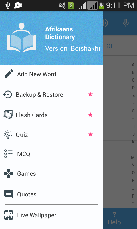 Papel de Parede da Tela Inicial: Você quer aprender palavras mesmo fora do aplicativo? Sim, você está certo. Isso agora é possível com nosso recurso de papel de parede animado. Na gaveta, selecione o papel de parede animado e você verá palavras com significado na sua tela inicial. Você tem muitas opções para personalizar esta tela de papel de parede. Palavras semelhantes podem ser selecionadas nos favoritos, histórico e na seção Palavra do Dia. O período de tempo também pode ser selecionado por você. Hoje, Ontem, Esta semana, Semana passada, Todos os horários e muito mais. Nas configurações de papel de parede, você pode personalizar totalmente a tela. Ative e aproveite este recurso.