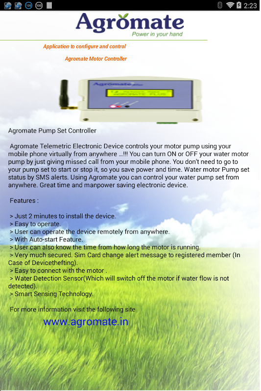 Android Agromate controls the Agromate Telemetric Electronic Device.