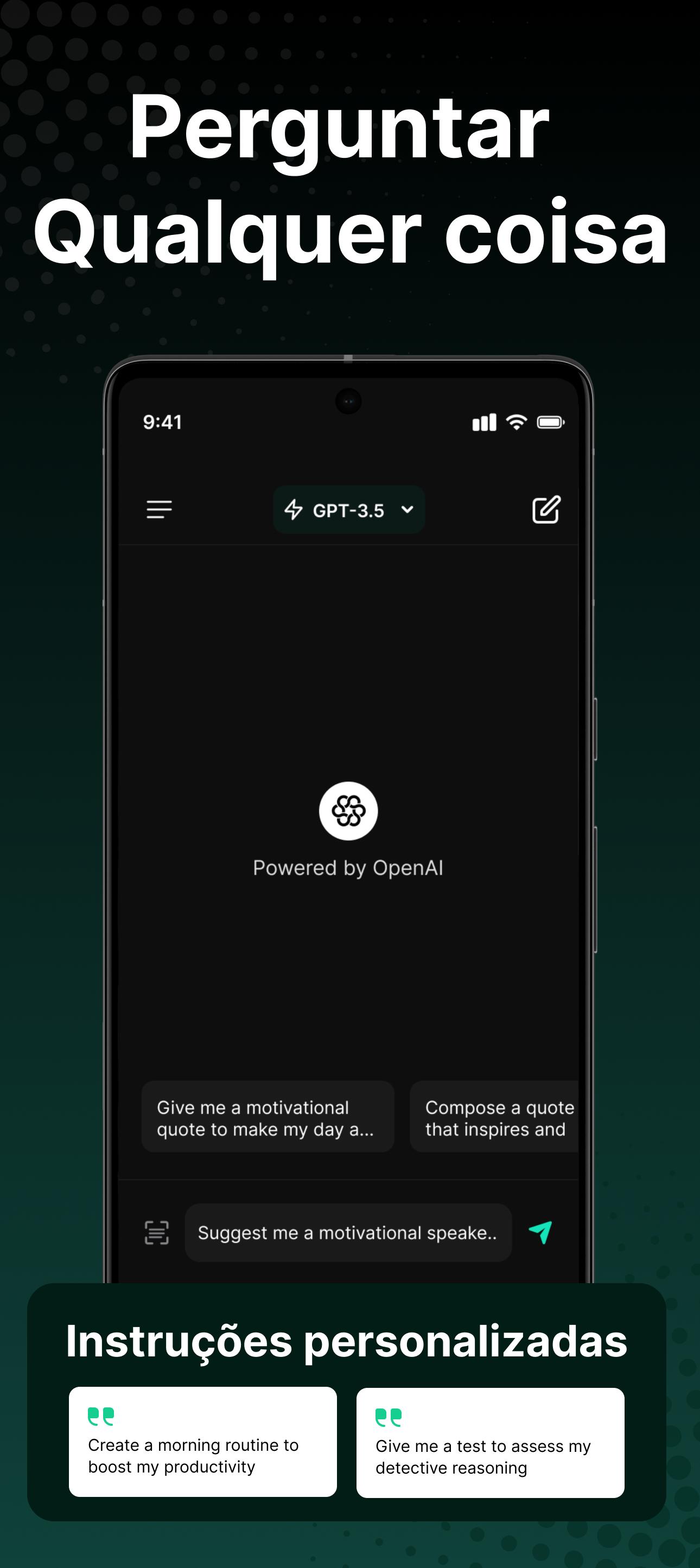 Bem-vindo ao nosso avançado aplicativo Chat AI Bot em Português desenvolvido com tecnologia ChatGPT, GPT 3, GPT-3.5 Turbo, GPT-4, GPT-4 Turbo e GPT-4o. Converse GPT + com nosso bot de bate-papo Openai para obter respostas precisas e perspicazes às suas perguntas.