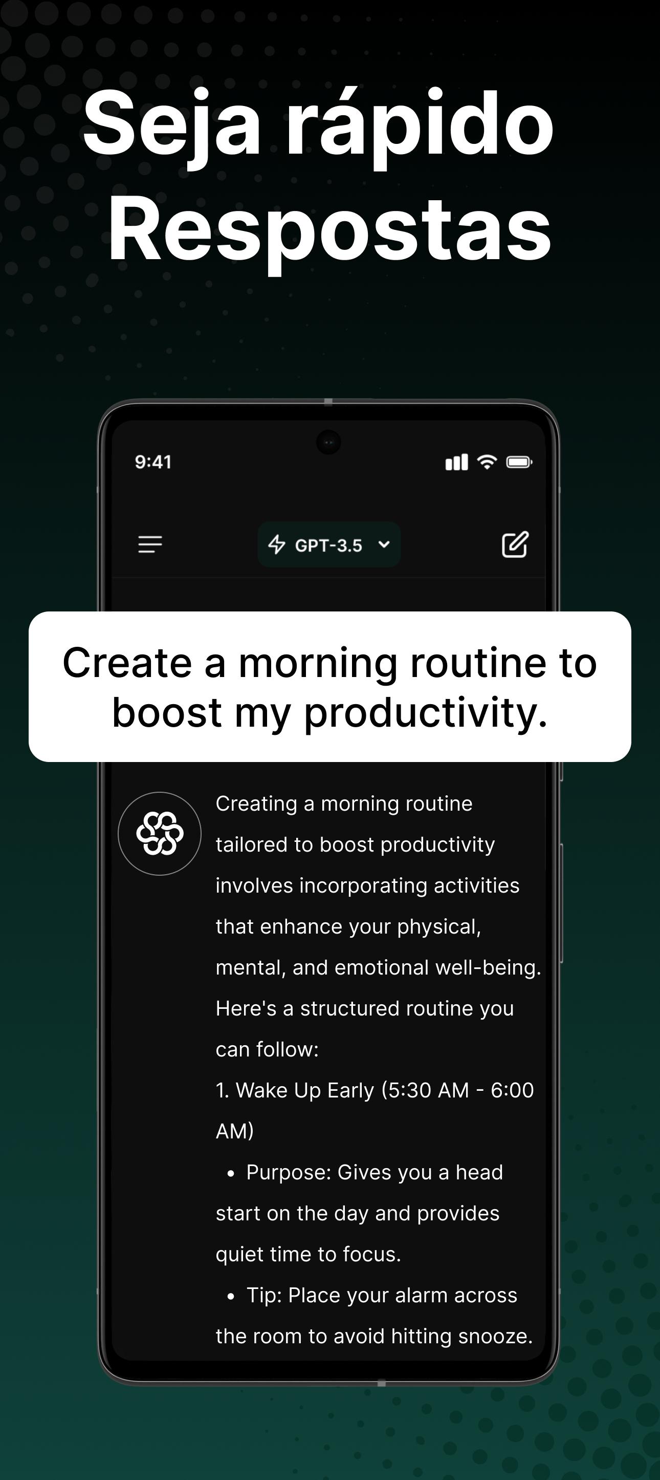 Você vai se sentir como se estivesse conversando com um amigo. AI Chatbot Assistant é amigável, com tom coloquial e recomendações personalizadas, baseadas no aplicativo Chat GPT Free e GPT-4 Turbo, facilitando o bate-papo sobre qualquer coisa, do mundano ao profundo. AI Chat bot Assistant utilizando ChatGPT para Android e GPT-4 gratuito, oferece recomendações personalizadas com base em suas preferências e interesses.