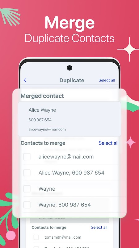 • Merge duplicate numbers into one contact to keep your address book organized