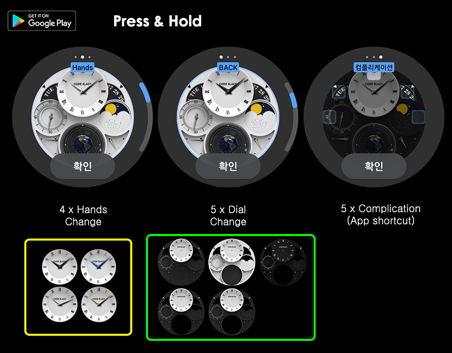 4 vezes a mudança de estilo dos ponteiros (prata, azul, dourado, preto)