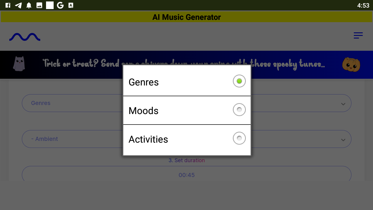 Generate AI music in 3 simple steps, 1. Select a Category, 2. Pick a Genre, and 3. Set Duration and Click Generate.