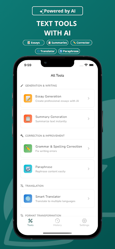 Quer escrever mais rápido, com maior qualidade e sem complicações? Nosso aplicativo de ferramentas de texto com IA permite que você gere, aprimore e personalize qualquer texto em questão de segundos.