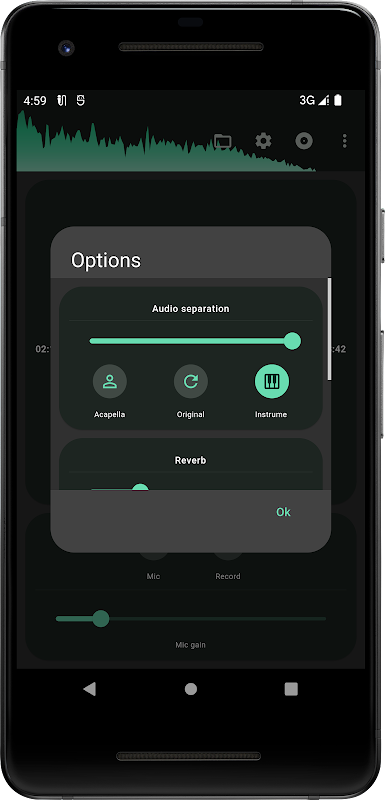 O aplicativo permite converter qualquer música em uma versão instrumental (ou versão vocal) para karaokê, suportando conversão e reprodução em tempo real. É ótimo para praticar canto e fazer covers.