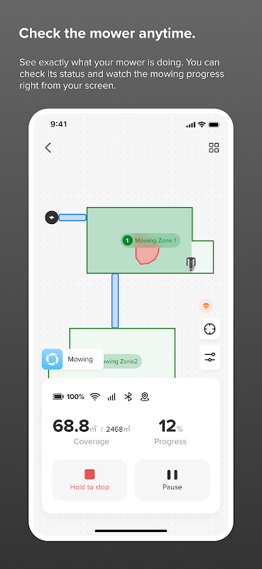 3. Verificar o cortador de grama a qualquer momento. Veja exatamente o que seu cortador de grama está fazendo. Você pode verificar o status e acompanhar o progresso do corte diretamente na tela.