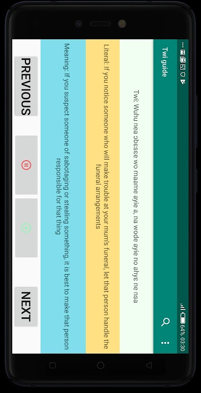Agora vamos falar um pouco sobre áudio. É uma coisa diferente saber a palavra e uma coisa completamente diferente saber como pronunciá-la. Também saber pronunciá-lo como os nativos (alguém de Gana) fazem pode ser uma coisa bem diferente. O aplicativo Akan Twi Guide possui um recurso de áudio que faz você tocar na palavra Twi e ouvir um som claro de um falante nativo.