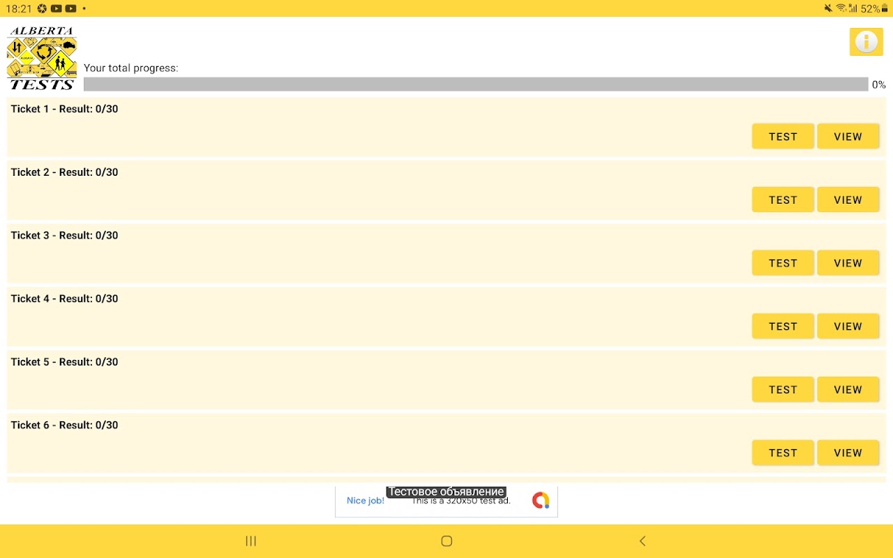 Para iniciar o teste pressione o botão Iniciar na lista de tickets. Para revisar suas respostas ou encontrar as respostas corretas, pressione o botão Visualizar. As respostas corretas serão destacadas em verde, e as respostas incorretas serão destacadas em vermelho. O aplicativo calcula seu progresso com base nas respostas corretas, portanto você pode vê-lo na parte superior da tela. Então seu progresso chegará a 100%. Certifique-se de estar pronto para o teste real. Você pode pegar qualquer ticket várias vezes até acertar todas as questões.