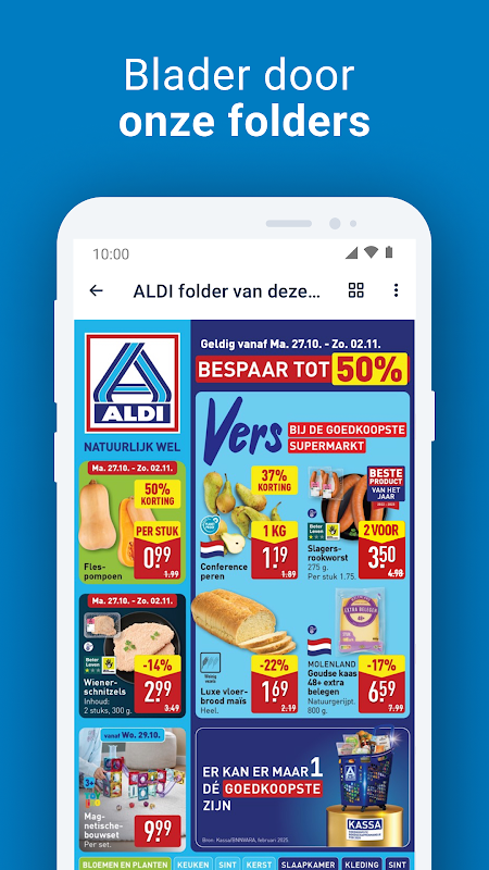 Você prefere ver as ofertas no folheto? Sem problemas: no aplicativo ALDI você encontrará todos os folhetos atuais, desde ofertas semanais até a linha de vinhos. E a melhor parte: muitos produtos têm links diretos, então você pode ver facilmente mais fotos e informações adicionais. E, a propósito, com o folheto digital você também economiza papel – e, assim, protege o meio ambiente.