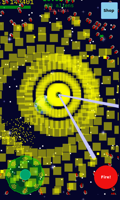 Invasão alienígena é um jogo de tiro espacial 2D para Android. Você controla uma pequena nave espacial e atira em alienígenas. Cada novo nível apresenta um novo tipo de alienígena. Alguns alienígenas deixam cair ouro que pode ser usado para melhorar a nave. Alguns alienígenas podem atirar de volta.
