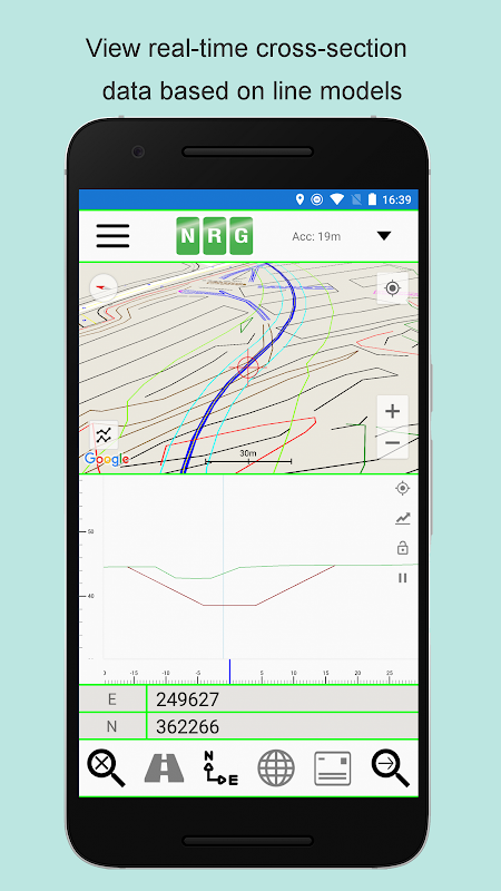 Perfeito para colocar no painel do veículo O modo paisagem do NRG Alignment Viewer fornece atualizações claras e em tempo real para a posição do dispositivo em termos de coordenadas WGS84, cartesianas EN e alinhamento geométrico (cadeia/estação/medição).
