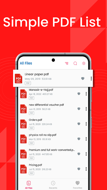 Outro grande recurso de All PDF:PDF Reader-PDF Viewer é a capacidade de adicionar seus arquivos de documentos essenciais aos favoritos com apenas um clique. Seus arquivos PDF favoritos serão adicionados a uma lista especial que você pode acessar de forma rápida e fácil. Você também pode desmarcá-los quando quiser. E quando você abre um documento PDF, o aplicativo o adiciona automaticamente à lista Recente, tornando mais fácil encontrá-lo novamente mais tarde.