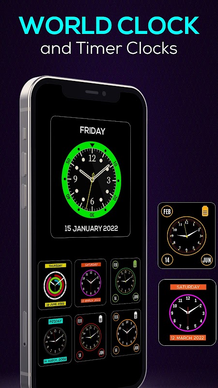 Diferentes gêneros de relógios, como exibição de relógio analógico, relógio digital, mostrador de relógio LED, relógio inteligente sempre em exibição, relógio de foto, relógios emoji e papéis de parede de relógio ao vivo