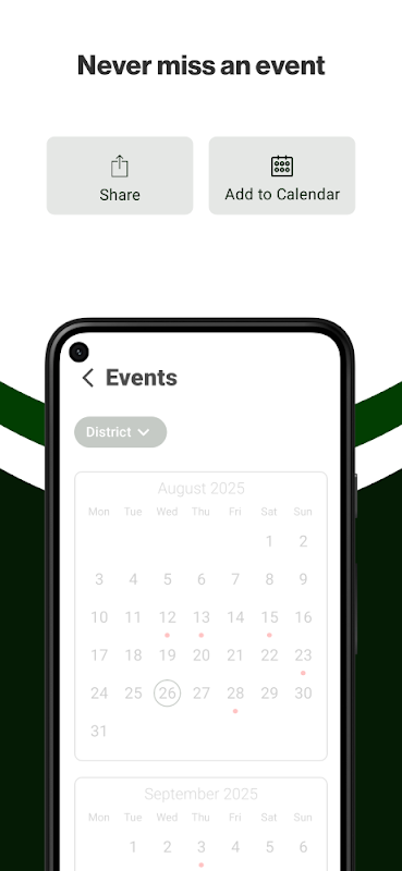 A seção de eventos mostra uma lista de eventos em todo o distrito. Os usuários podem adicionar um evento ao seu calendário para compartilhar o evento com amigos e familiares com um toque.