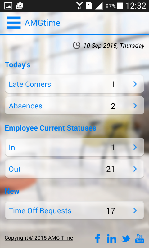A aplicação móvel AMGtime é um componente da solução on-line Sistema de Atendimento AMG. O aplicativo permite que os empregados para perfurar dentro e fora remotamente a partir de locais pré-atribuído usando seus telefones celulares. Perfuradores móveis estão sendo transferidas para o sistema de um modo em tempo real. Usando esta aplicação, os funcionários também podem realizar transferências de departamento e de emprego, bem como ver as mensagens atribuídas pelo administrador do sistema.