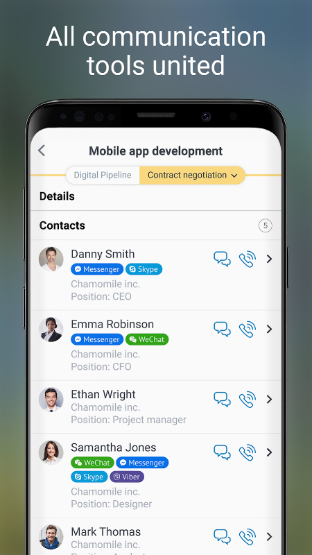 O amoCRM é um CRM baseado em mensagens para pequenas e médias empresas. A comunicação multicanal permite que você converse através de mensageiros, e-mails e chamadas de um único aplicativo. Agora, toda interação com seus clientes pode ser um diálogo individual personalizado. Além disso, os gerentes adoram nossas poderosas ferramentas de análise, relatórios e automação. É a solução perfeita de vendas baseada em mensageiros para empreendedores e pequenas e médias empresas.
