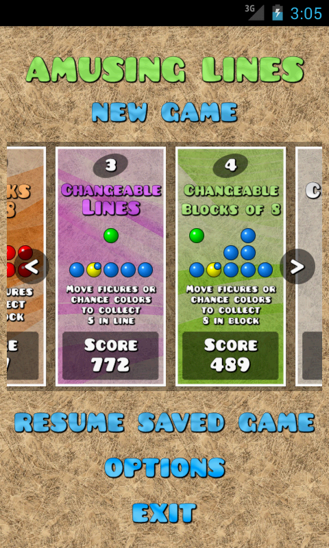 Amusing Lines is a logical puzzle game with original idea to change colors of figures. The goal is to get as much points as you can, cleaning figures from table. It contains 5 different games: