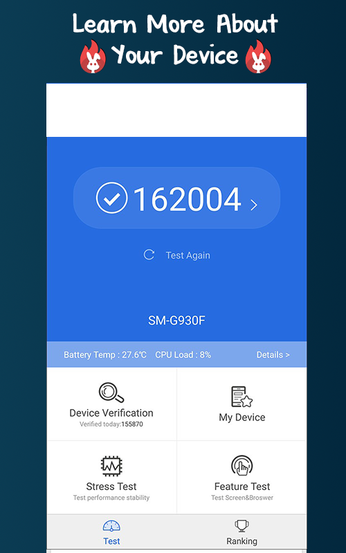 AnTuTu Benchmark Test é usado para medir a resistência do seu dispositivo durante a primeira fase do AnTuTu Benchmark. Além disso, é muito útil se você está pensando em baixar jogos com gráficos de alto desempenho.