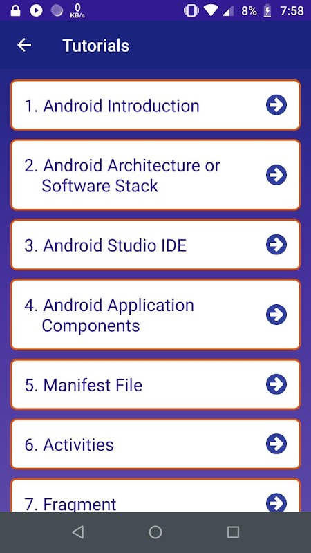 Nesta seção que contém o conteúdo programático, os usuários podem encontrar o aspecto teórico sobre o Desenvolvimento de Aplicativos Android e fácil de aprender sobre os conceitos básicos do Desenvolvimento Android. Sugere-se que os usuários passem por esses tutoriais antes de informar a programação do Android.