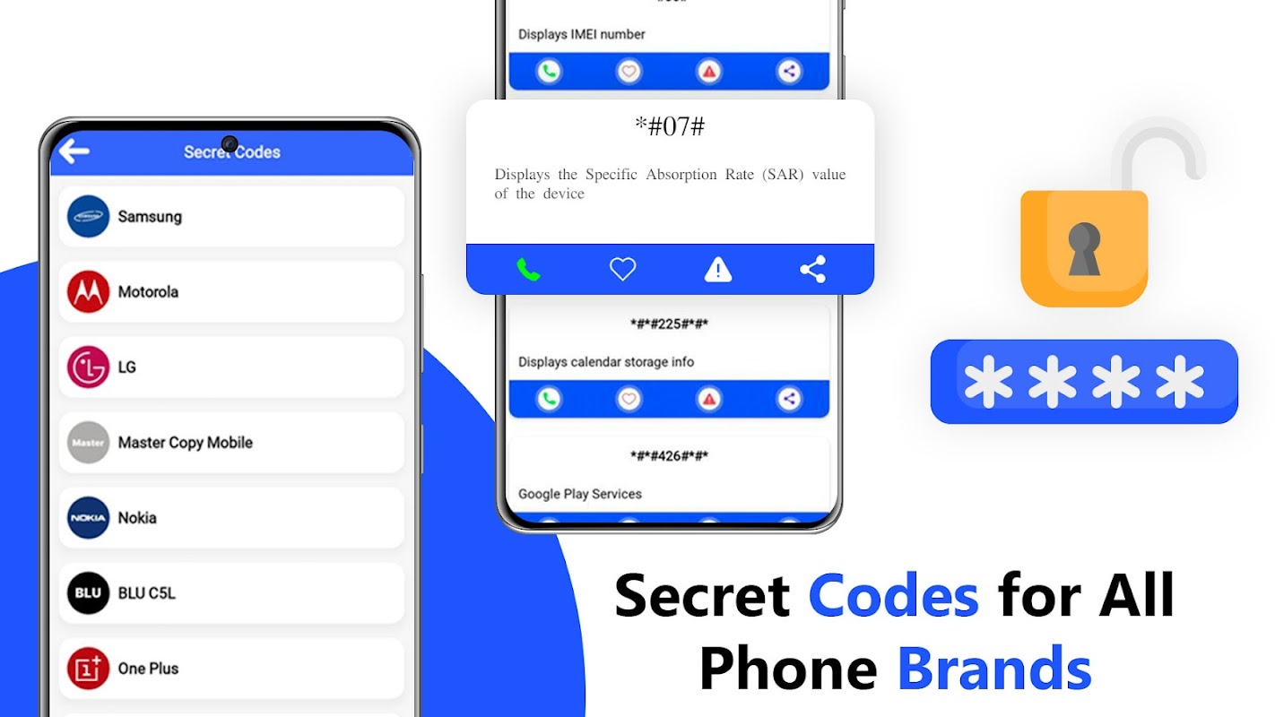 Os códigos secretos do telefone são códigos de discagem exclusivos que revelam menus e configurações ocultos no seu telefone. Truques e dicas móveis para códigos secretos do Android ajudam você a acessar algumas configurações e ferramentas adicionais, como verificar seu número IMEI, status da bateria e status de uso, sem memorizar cada um deles. O aplicativo de código secreto do telefone é simplesmente um guia para explorar o potencial oculto do seu dispositivo Android.