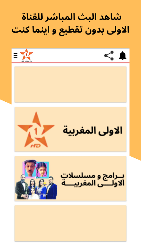 شاهد البث المباشر للقناة الاولى المغربية بدون تقطيع و اينما كنت ، البرامج و المسلسلات و افلامك المفضلة الحصرية بكل سهولة في بث مباشر على هاتفك . بضغطة زر واحدة و بكل سلاسة استمتع بالبث المباشر للقناة الاولى المغربية