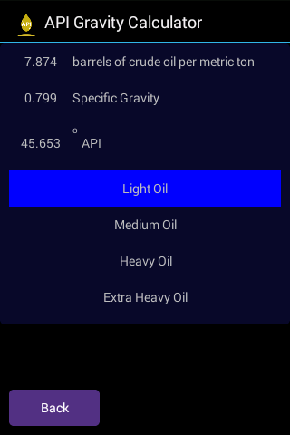 A gravidade API ou gravidade do American Petroleum Institute é um termo frequentemente usado para medir o quão pesado ou leve um líquido de petróleo é comparado à água. Este aplicativo permite que você execute qualquer uma das seguintes operações: