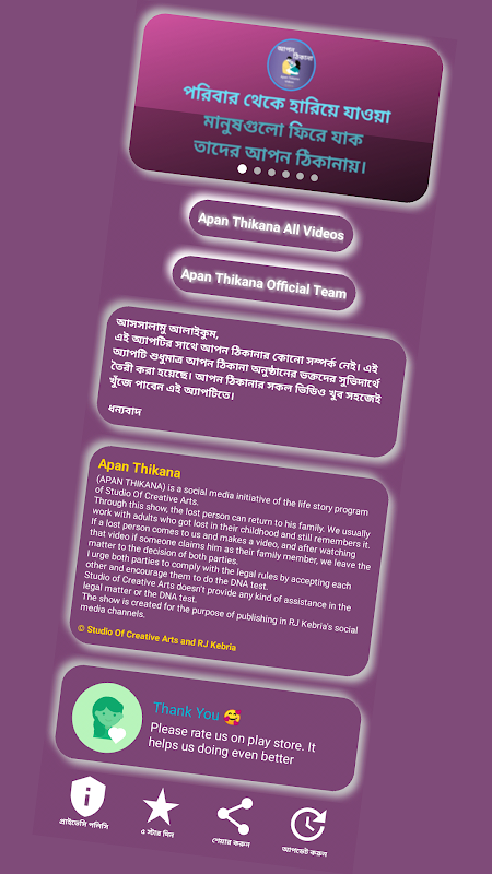 "APAN THIKANA" é uma iniciativa de mídia social do programa de história de vida do Studio Of Creative Arts. Através deste show, a pessoa perdida pode retornar à sua família. Costumamos trabalhar com adultos que se perderam na infância e ainda se lembram disso. Se uma pessoa perdida vier até nós e fizer um vídeo, e depois de assistir a esse vídeo se alguém o reivindicar como membro da família, deixamos o assunto à decisão de ambas as partes. Exorto ambas as partes a cumprirem as regras legais, aceitando-se mutuamente e incentivando-as a fazer o teste de DNA. O Studio of Creative Arts não presta nenhum tipo de assistência na questão legal ou no teste de DNA. O programa foi criado com o objetivo de publicação nas redes sociais de RJ Kebria.