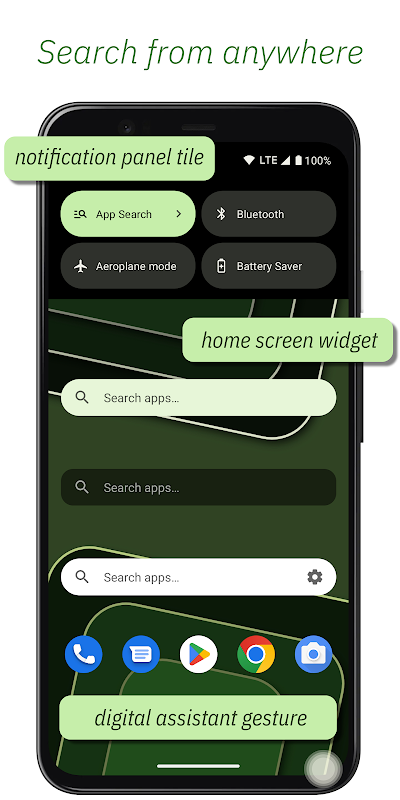• Inicie sua pesquisa em qualquer lugar, definindo o aplicativo como seu assistente digital ou iniciando-o a partir de um widget ou bloco do painel de notificação