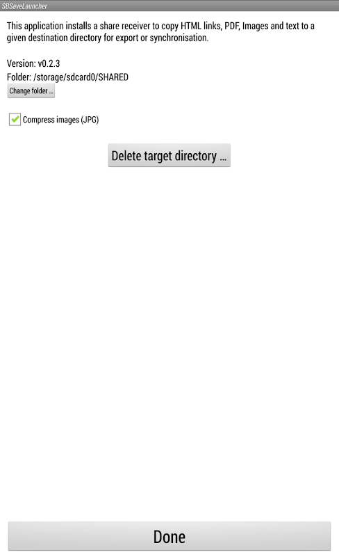 App para instalar um "share" Android menu (intenção) em outros aplicativos que permite copiar rapidamente páginas, eventos de calendário, documentos PDF, imagens e texto em um determinado diretório de destino. A idéia é usar este diretório para exportação ou sincronização.