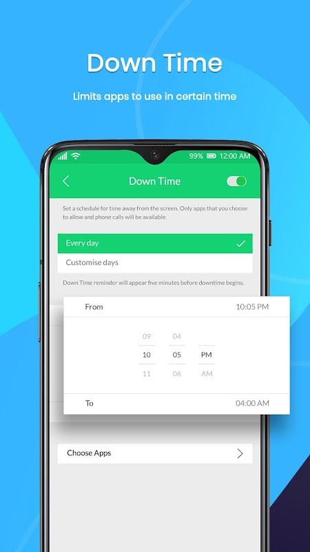 Down Time section of App Use Time Tracker & Controller app facilitates the user to set downtime for phone. Only apps selected by user and phone calls are available during the set downtime period.