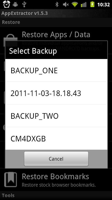 AppExtractor is a tool which will allow you to restore individual applications, data, SMS, and MMS messages from your ROM Manager backups.