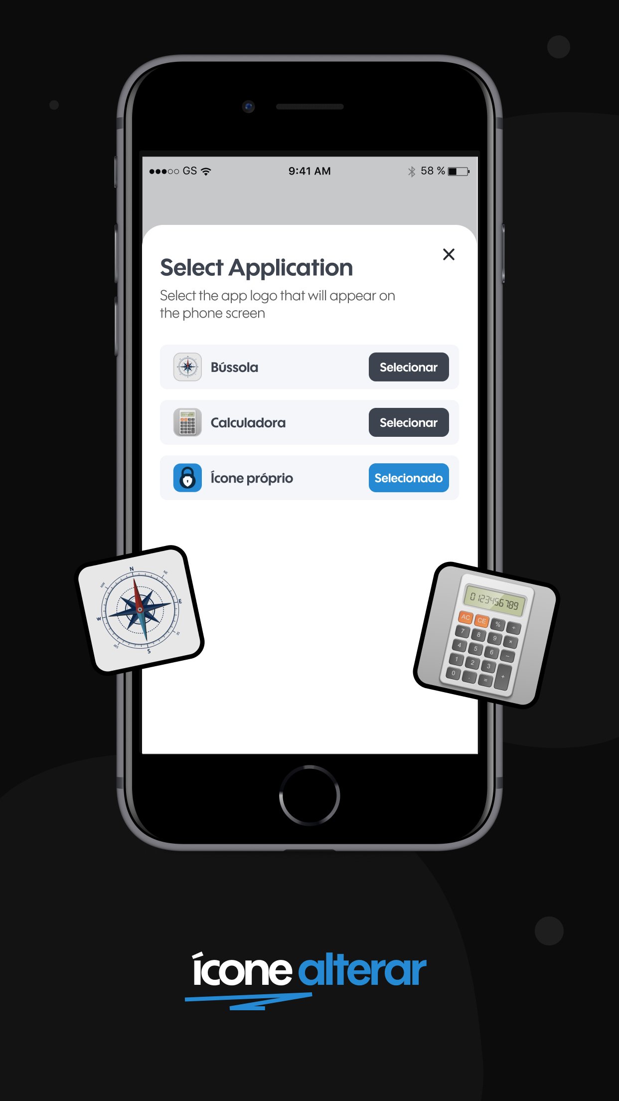 Disfarce o aplicativo como qualquer outro alterando o ícone original do aplicativo. Confunda os bisbilhoteiros para evitar que este aplicativo seja encontrado por outras pessoas.