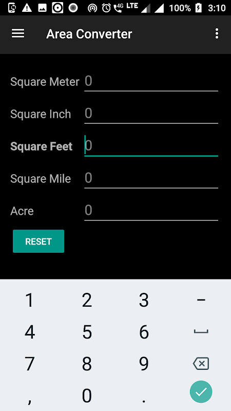 Unidades incluídas são: sq mm, sq cm, sq m, sq km, sq polegada, sq pés, sq jarda, sq milha, acre, hectare.