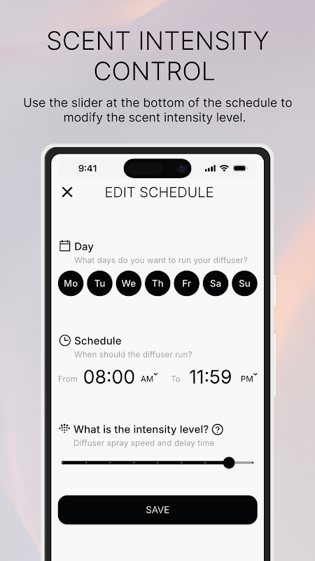 Se você prefere ficar com o difusor ligado o dia todo, apenas nos finais de semana, antes de dormir ou ao acordar, o app AromaTech pode agendá-lo. Cada difusor pode ter até cinco horários programados de acordo com seu estilo de vida.