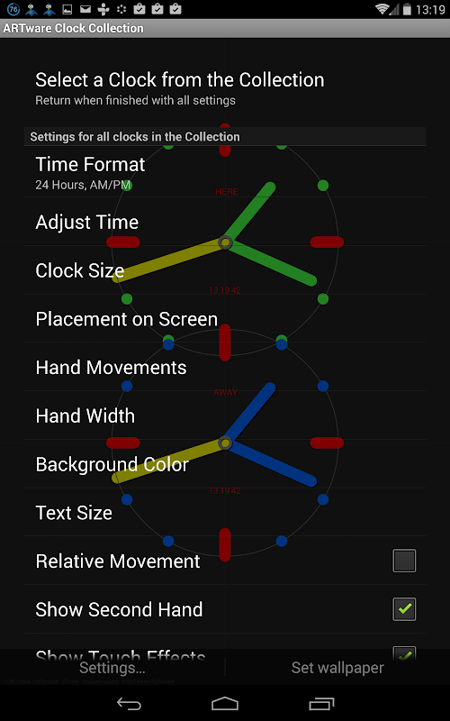 A coleção Relógio Artware combina elementos analógicos e digitais, resultando em um design minimal art moderno para todos os relógios apresentados. O ART-ware Relógio Colecção Live Wallpaper (LWP) inclui o geométrico, ExZentric, DeKonstr, KruKru, TwoTimer, Regular, o Astro de novo, e os relógios inéditas Multi e Grid.