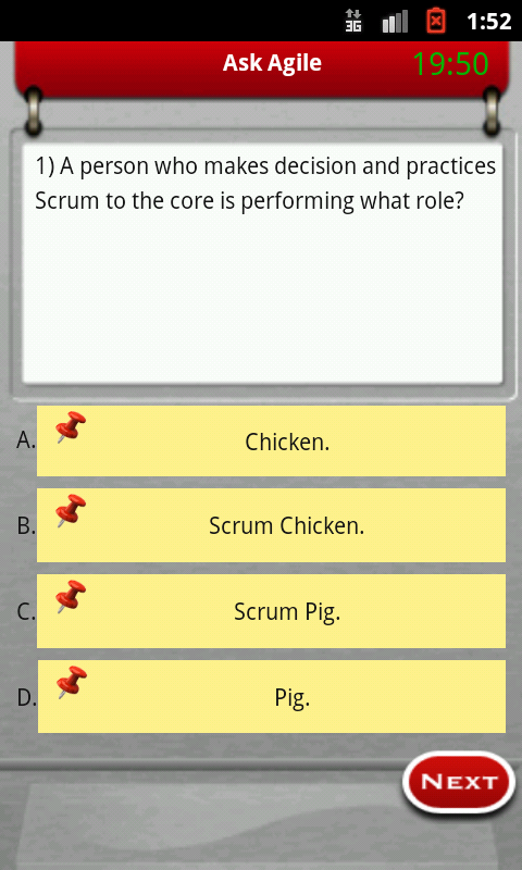 Ask Agile helps to improve your Agile skills by systematically walking you through effective practice questions with multiple choice answers. There is no limitation on the number of exams you can take. Each quiz will takes less than 20 minutes only. Ask Agile provides you an interactive way to learn Agile basics and to prepare for Agile certifications. With over 200 sample exam questions based on Agile fundamentals, tools and process Ask Agile take you one step closer to the ACP, Certified Agile Practitioner, Scrum Master exams.