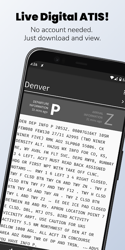 Isenção de responsabilidade: o aplicativo ATIS não deve ser usado como uma ferramenta de planejamento de voo. Nenhuma garantia está implícita ou garantida quanto à precisão das informações fornecidas. Planeje voos usando apenas ferramentas aprovadas pela FAA. O uso deste aplicativo implica consentimento com este aviso.