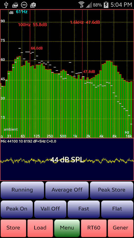 Características: modos RTA de 1/1, 1/3, 1/6 e 1/12 de oitava, Leq (banda larga, oitava, duração variável), Sones (Loudness), RT60 (banda larga, oitava), Peak Store, Spectrogram, Waterfall, Filtros de freqüência de pico, Impulso, Rápido, Médio e Lento, Ponderação Flat & A / C e indústria cinematográfica X Curva, Média, SPL Chart Recorder, Critérios de Ruído (NC e NR), Ruído Branco / Rosa, Senoidal, Quadrado, Triângulo, Varredura , Log Sweep, Warble, Ramp e Impulse signal & loudspeaker verificador de polaridade, L / R select. RTA Store & Load, janelas Hann, apertar para ampliar, vá até o centro.