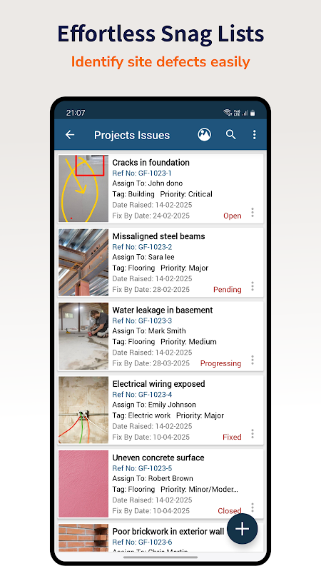 - Registre os problemas, tire fotos, adicione o responsável, selecione o status e selecione a data de conclusão.