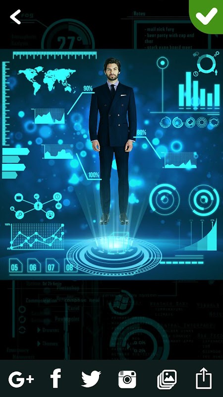 Se você gostou jarvis em portugues, o assistente de voz dentro do capacete Iron Man, agora você pode mudar seu ambiente do mundo real e personalizar suas fotos com este aplicativo Camera Realidade Aumentada. Faça uma imagem de perfil de tela Jarvis usando "realidade aumentada" efeito de câmera. Este aplicativo de editor de fotos de holograma virtual camera de realidade aumentada fará com que suas fotos fiquem futuristas quando você adicionar esses efeitos de filme sci fi. Crie sua própria realidade aumentada camera com essa incrível holograma 3D adesivos para fotos e experimente a visão do olho do terminator, a visão do herói do Iron Man e muitos outros efeitos editor de fotos homem de ferro com este editor de fotos do jarvis assistente virtual. Baixe e experimente estes melhores efeitos CGI com texto e adesivos para imagens.