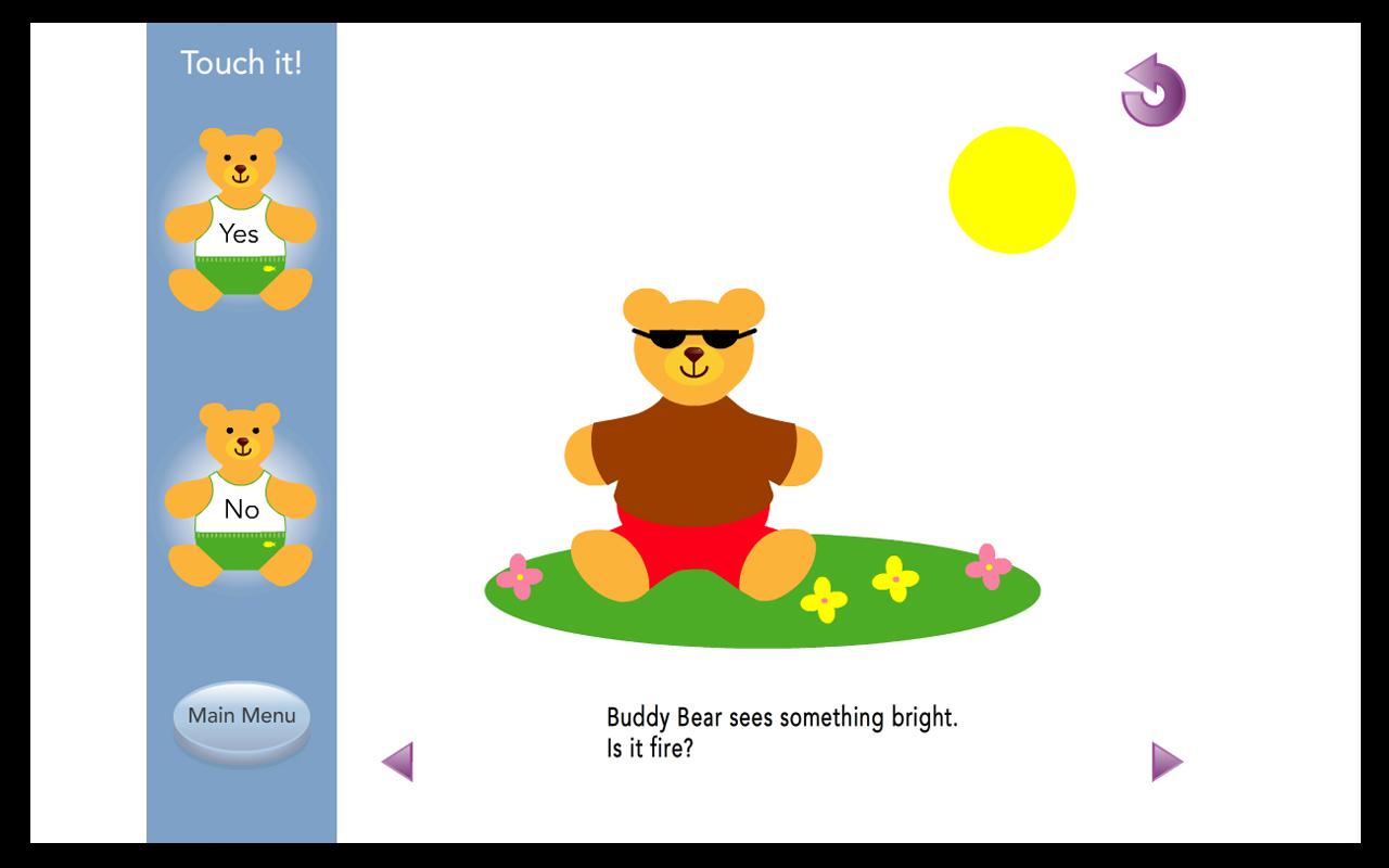 Once you start the app, tap on one of the five stories. Back, forward, and repeat arrows provide easy screen navigation. Correct responses are reinforced with a friendly “Good job!”
