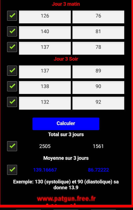 Folha de resultados de medição de tensão com média dentro de 3 dias.