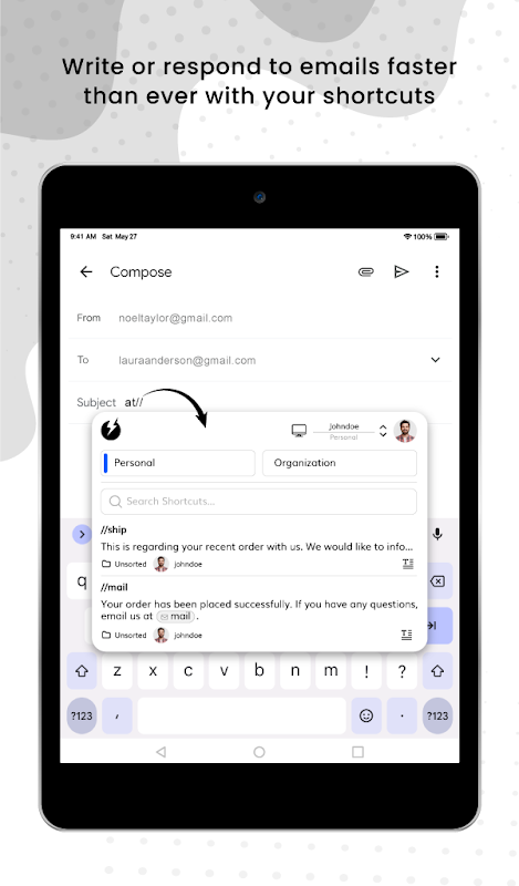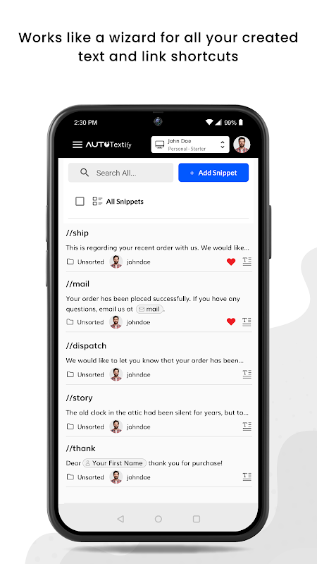 Personalize trechos de texto, substitua a digitação repetitiva e economize tempo e esforço.