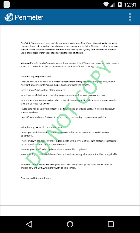 AvePoint Perímetro conecta os trabalhadores móveis para o conteúdo do SharePoint da empresa, enquanto reduz o risco organizacional, assegurando o cumprimento e aumentando a produtividade. O aplicativo fornece um recipiente seguro e uma interface acessível para a partilha de documentos e sincronizar com usuários externos autorizados.
